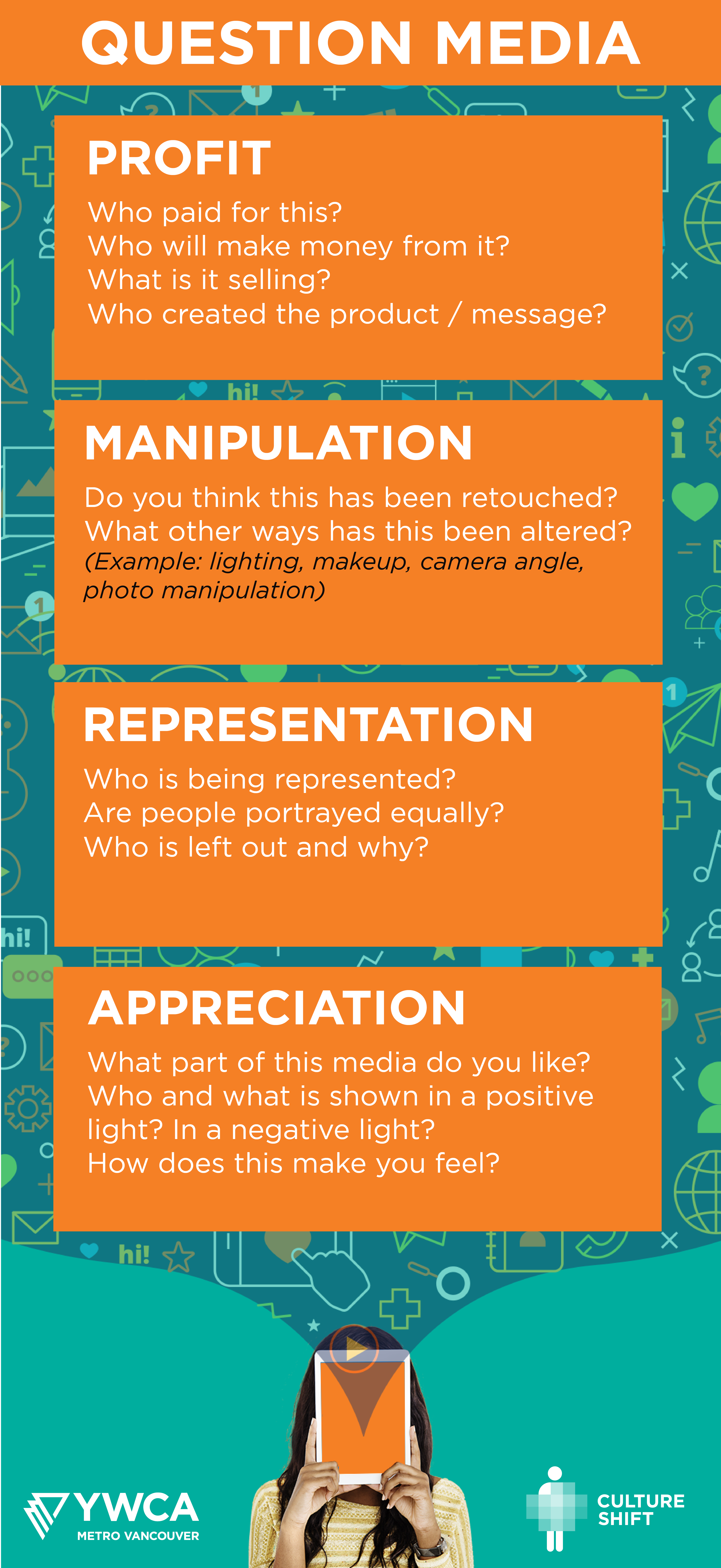 The first step in media literacy is understanding some of the post-production techniques that marketers employ to sell us a more “perfect” product. Images are regularly, if not always, enhanced to make models appear slimmer, whiter, younger and smoother. One of my favourite tools for introducing these practices is the Dove Campaign for real beauty video, Evolution. It really hits home how the images of people we so often see hardly resemble that person in real life. Primarily used to retouch ads of women, post-production edits to men’s images are becoming increasingly common as well. And, while Photoshop used to be a post-production tool reserved for professional photographers and marketers, it’s now a readily available technology used by anyone. Apps like Facetune let anyone with a smartphone digitally enhance, edit and retouch their images for a “more perfect” selfie. Consider that the next time you scroll through Instagram!